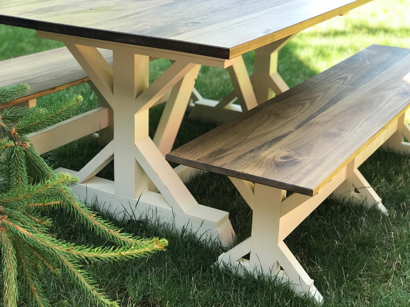 Fancy Farmhouse Table & 2 Benches 40”W x 30”H x 72”L Table Top: Poplar Hardwood 40”W Table Base: Fir Wood Bench Base: Pine/ Fir Wood Top: Poplar Hardwood **This price is for what’s listed above** Prices will vary for different size/style