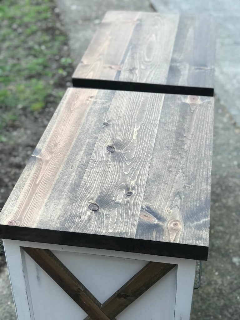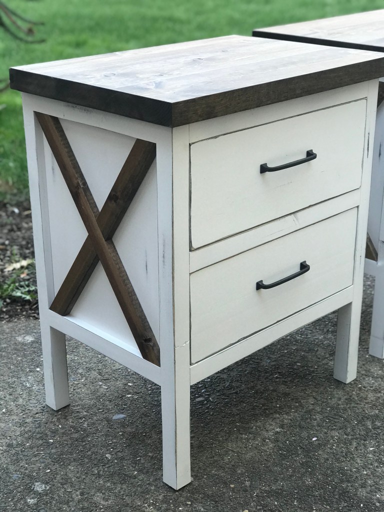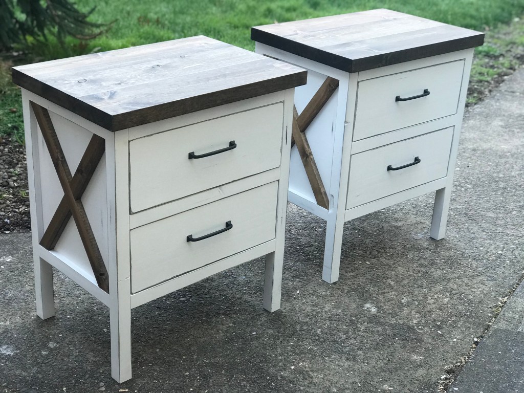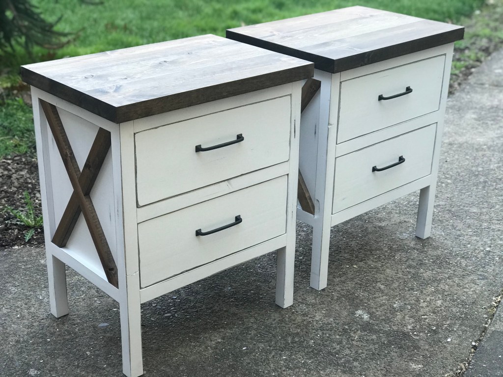 The Night Stand SET was built with Pine. I stained the Night Stand base with Dark Walnut and used the same Behr white and distressing technique. The X’s are stained in Dark Walnut.