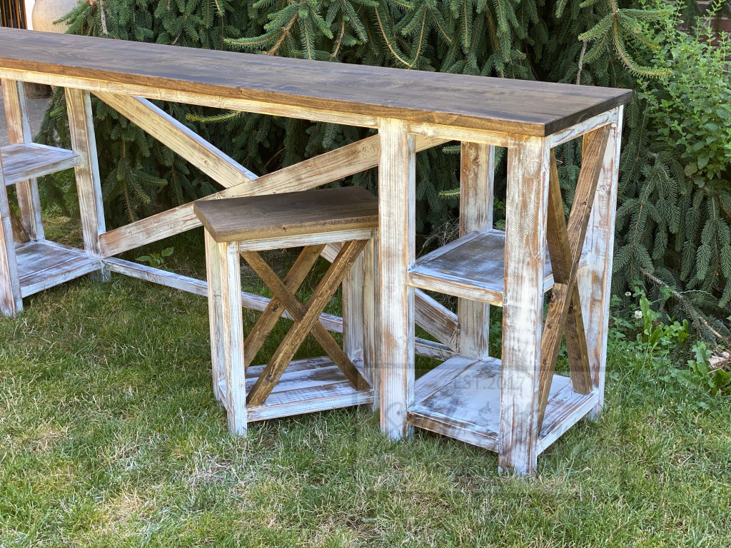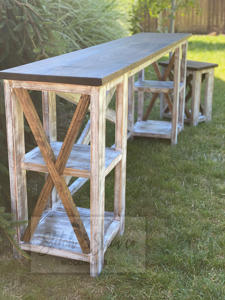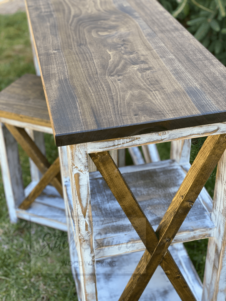 I made this for a returning client. It’s a Bar Height Sofa Table and matching End Table. The tops are stained in Dark Walnut and made with Poplar Hardwood. The X’s are Pine and also stained in Dark Walnut. The bases are done with a distressed technique using white and stain, built with KILN dried Fir, Pine and Birch wood. I think go over all the base and just sand until I’m happy with the distressing. The tops and base are then sealed. The Console fit 2-3 stools and a perfect spot to have a snack, entertain, and more. The shelving is perfect to hold some home decor pieces or maybe store some wine. Lots of options.