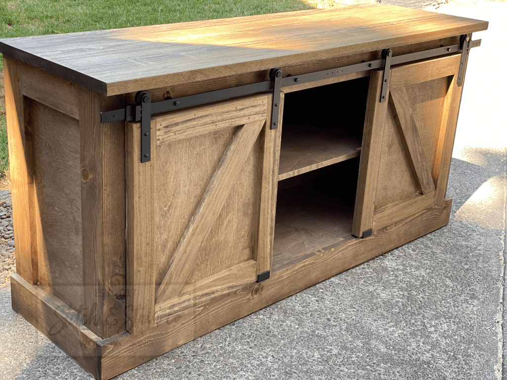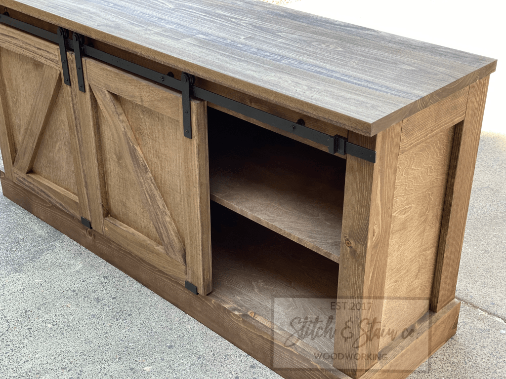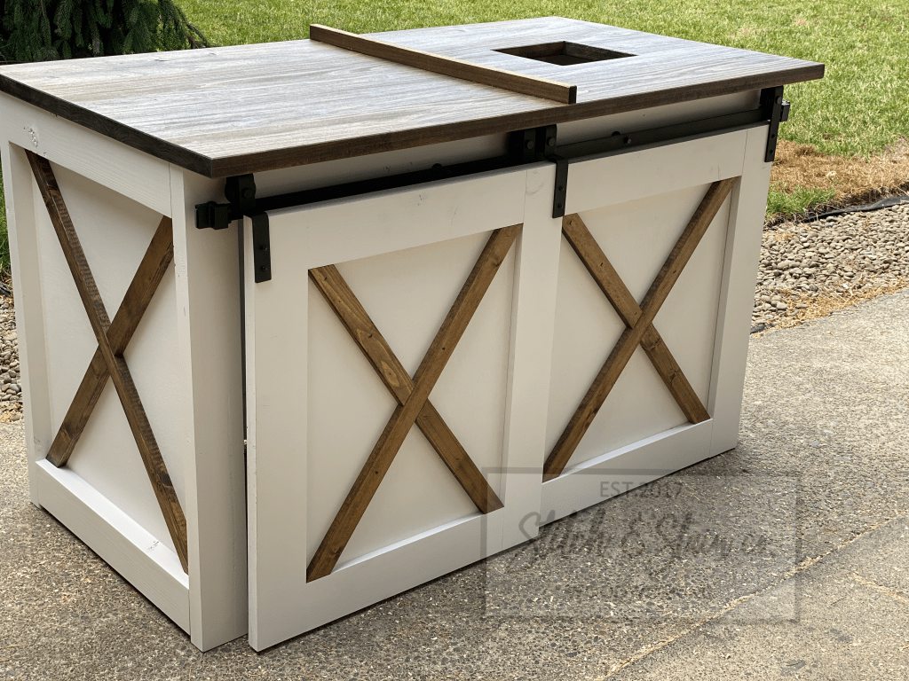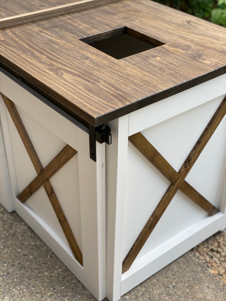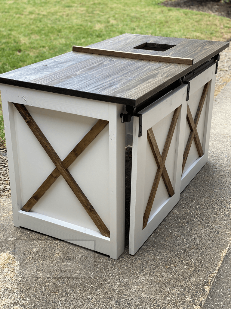 This Bypass Sliding Door Recycle Console was a Custom order that was shipped to New Jersey! The client was wanting something that would hide the recycle cans, but also have some counter space to put down your purse, keys and more. So we added a divider in the middle to separate the top. The top is stained in Dark Walnut and made with Poplar Hardwood. The base is painted in Sherwin Williams Futon. Built with Kiln dried Fir, Pine and Birch wood. The bypass hardware is black, which honestly was really hard to find for these doors. Most bypass hardware is meant for bigger barn doors. The doors are also painted in Sherwin Williams Futon, built with Pine and Birch. The X’s are Pine stained in Dark Walnut.
