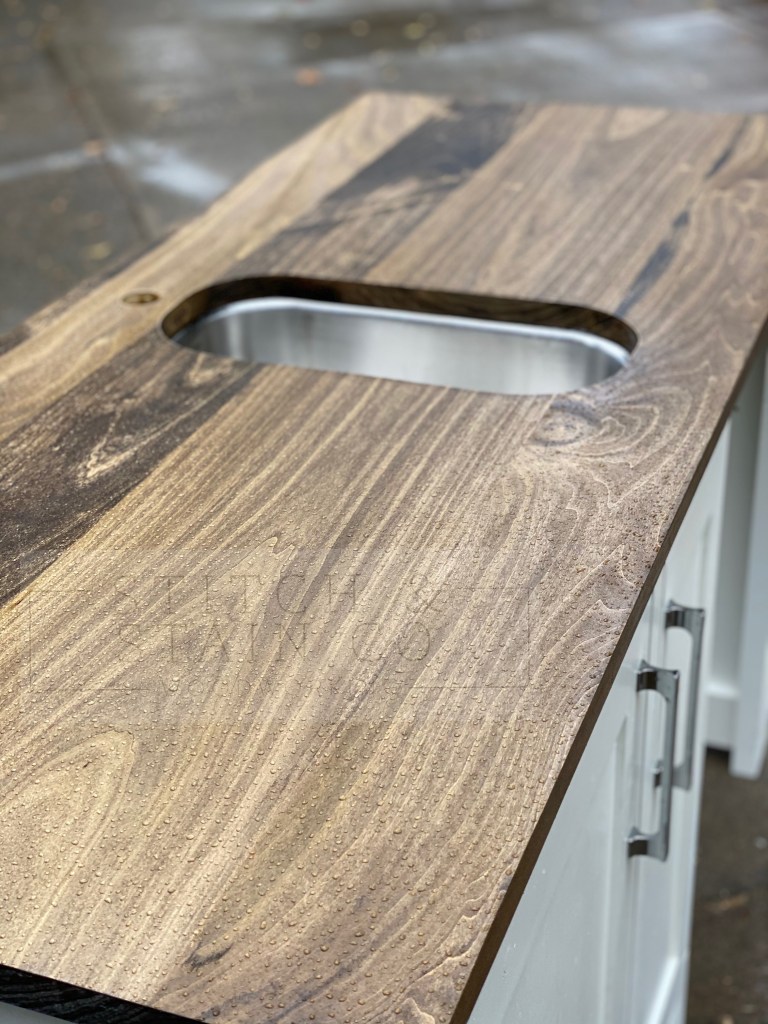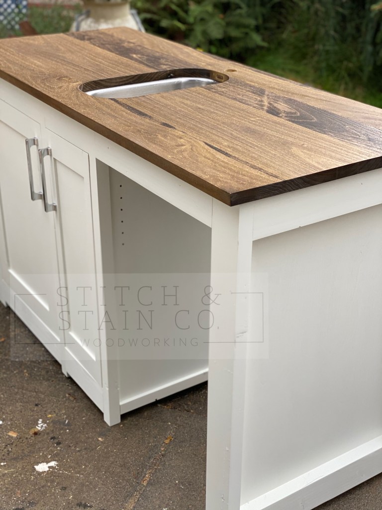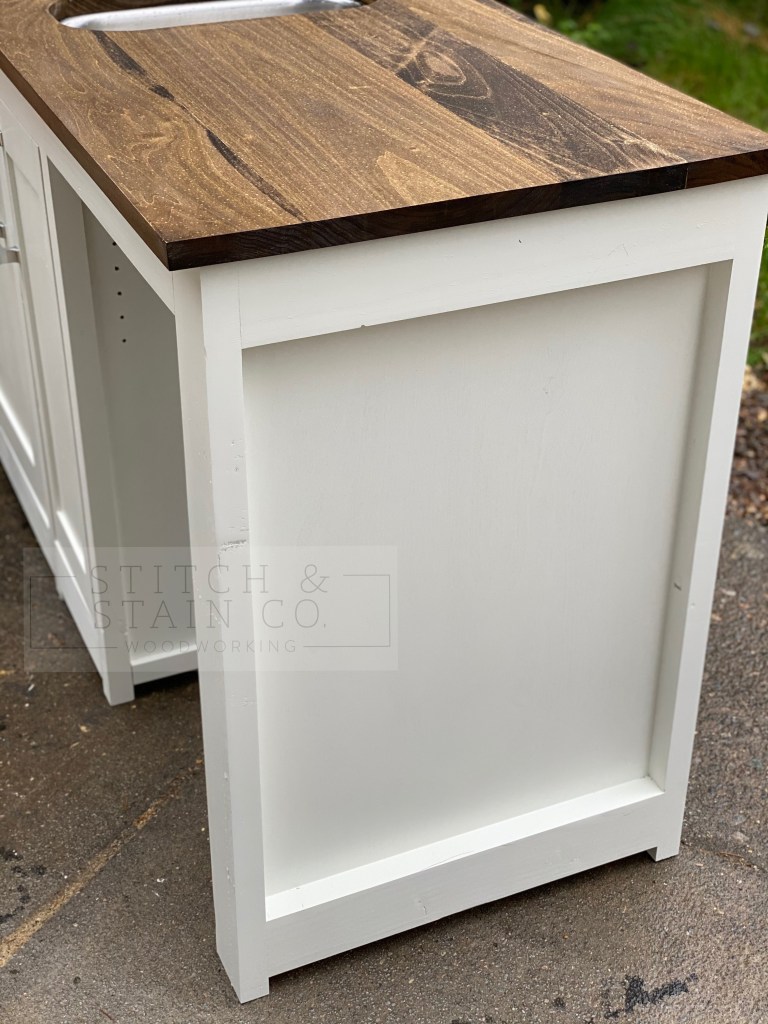 The Top was built with Poplar Hardwood. I stained the top with Dark Walnut by Minwax. Dark Walnut is the most popular stain color in the Shop. Because the top had a sink, was going to be used for prepping snacks and would be in the basement we used Spar Urathane. It’s more durable and it’s waterproof. We added 3 coats of it on the top, so it’ll be nice and protected while being used.