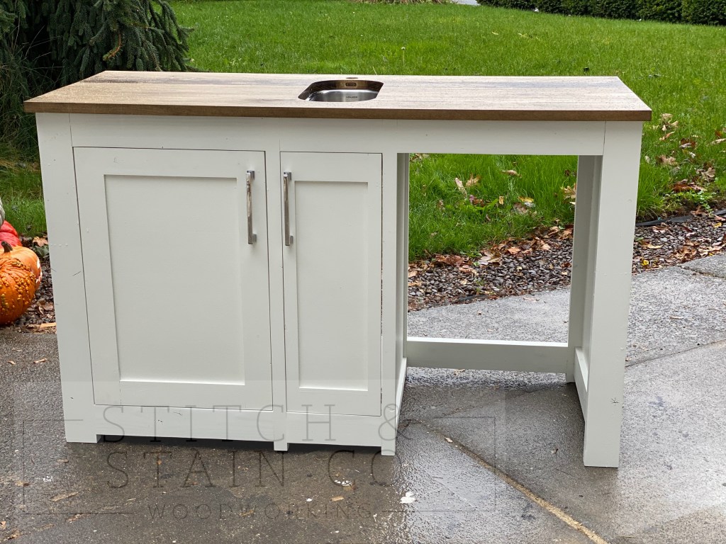 The kitchenette & Mini Bar overall dimensions were 58″W x 28″D x 36″H. The base is painted in Benjamin Moore White Dove Cabinet Enamel paint. We used Kiln dried fir, birch and pine wood for the base. Of course all are planed, jointed and sanded during assembly.
