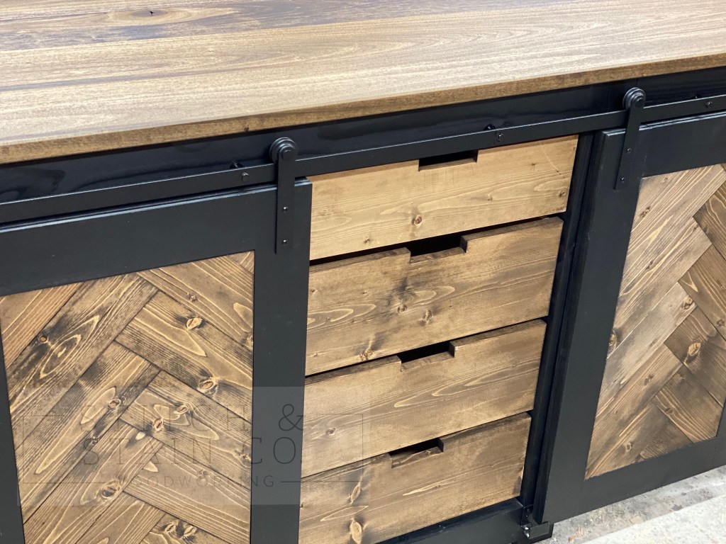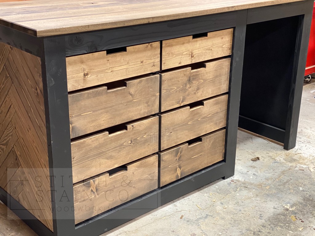 The Herringbone Mini Fridge Console just got a little better! We had a client in California that wanted to add some drawers to the console for more storage, so we made that happen. The overall dimensions of this build is 72’L x 28″D x 39″H