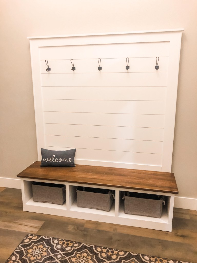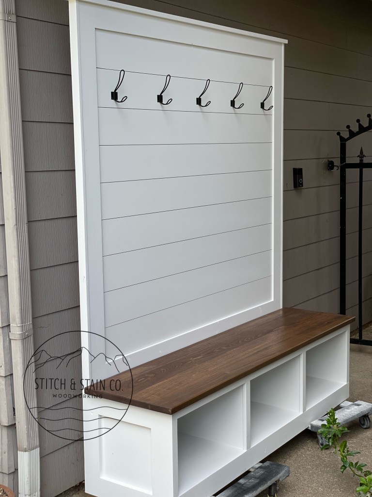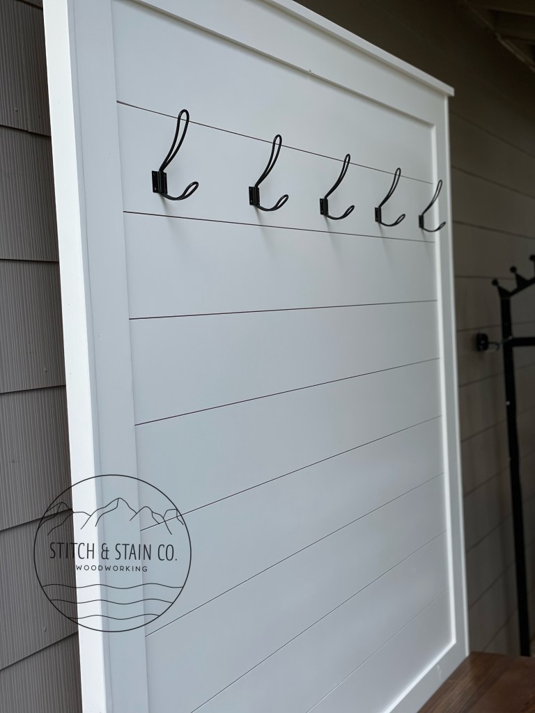 This Modern Farmhouse Hall Tree is 68″W x 78″H x 20″D. Made for a family of 4 and a cute dog. It was huge, but our client had a big entryway so it was perfect! Of course this can be modified to fit your home. I painted it in Sherwin Williams Extra White, to match the trim color in their home. Before all that though, I sprayed 3 coats of Primer. For the framing and bench base I used birch and Pine wood. For the hooks we used Black Modern Hooks. These are my favorite modern looking hooks. They also come in a brass color which I also love. For the shiplap I used a penny to give the perfect spacing. I left all the knots and any other wood characteristics. Those details add character to the build, so I always leave those.