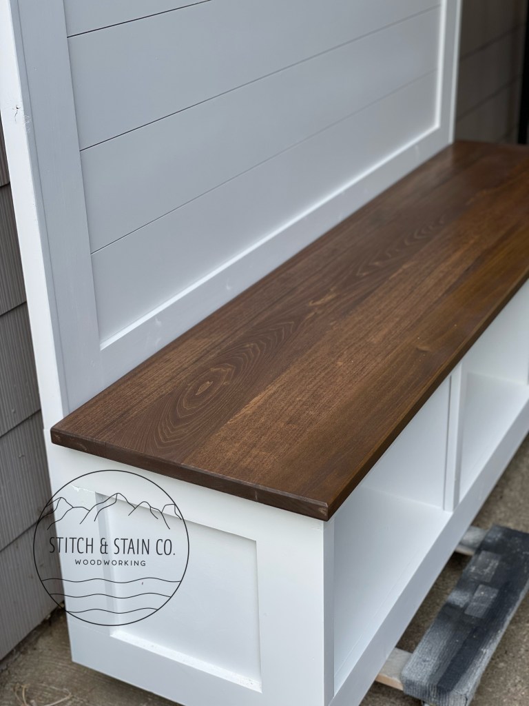 For the bench top I used Poplar Hardwood and stained it in Dark Walnut. While making this top and ripping the wood down, there was a surprise. A bullet. Yep, that’s right a bullet. My husband was helping me that day and was ripping down the wood when some pieces came flying out from the wood and hit him right in the neck and chest. After ripping all the wood we looked over all the pieces and found the hole that the bullet was stuck in. Later on while cleaning up our mess our daughter actually saw something shiny on the ground. It was the tip of the bullet. I have a pic, but its on his phone not mine, otherwise I would’ve attached it. It was a good story to tell our clients at pickup.