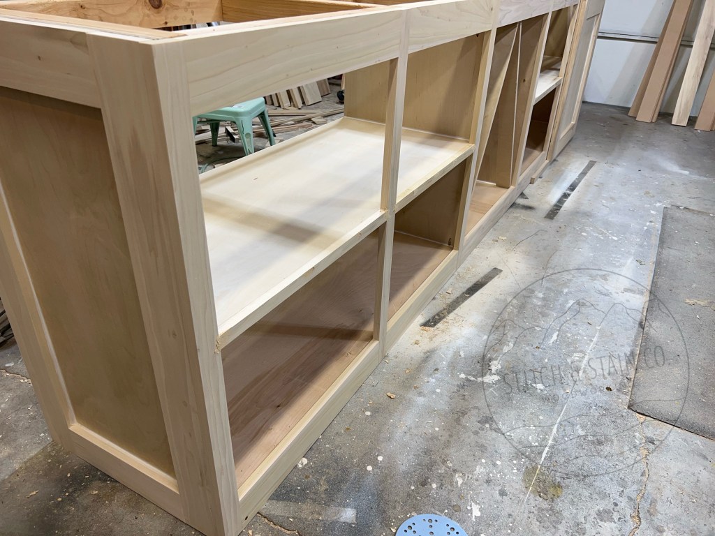 The Console is made out of Poplar Hardwood and Birch. There’s 5 sections with the middle as wine storage and 2 sliding doors. This was after I added the face frame. It was pretty long so I wanted to dry fit it before I attached it. I used some pin nails to keep it in place.