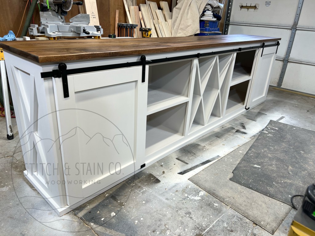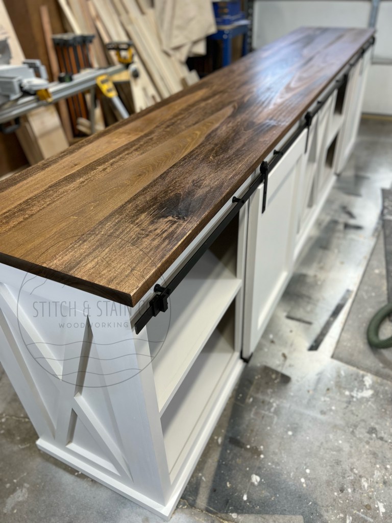 My longest console to date. This console is 126″L x 36″H x 22″D. This was a Custom Order for this particular space. When I get orders for a particular spot it always makes me nervous because I always think “What if I make it too big?!”. So Im constantly measuring as I go making sure I’m within the measurements.