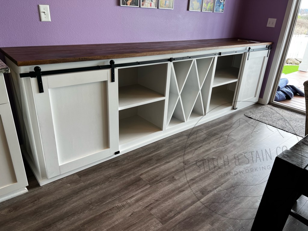 The paint color is Snowbound by Sherwin Williams and the stain color is Honey. I used Satin poly to seal the top. Lastly was the sliding door hardware in black.