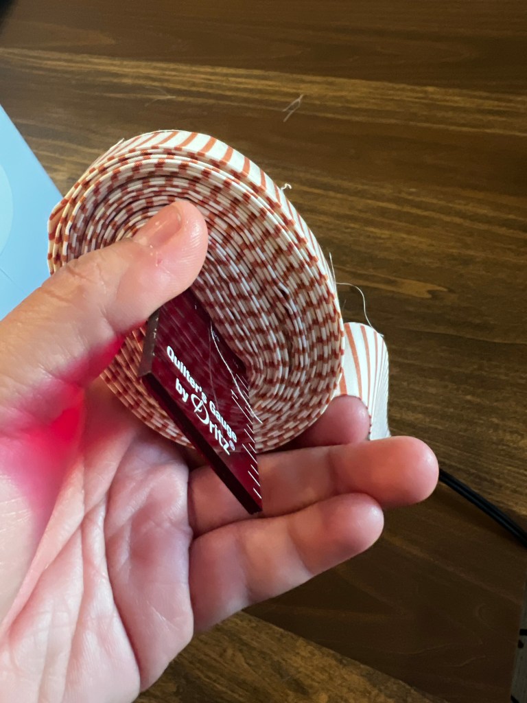 I think this step of quilting is called Basting. I went with the stitch and ditch. It means you sew through all the seams that you made. I think. I did not follow all the triangles, just the 4.5″ squares. The next part was the Binding. I was a little nervous because it was a stripe pattern and any flaws would definitely show.