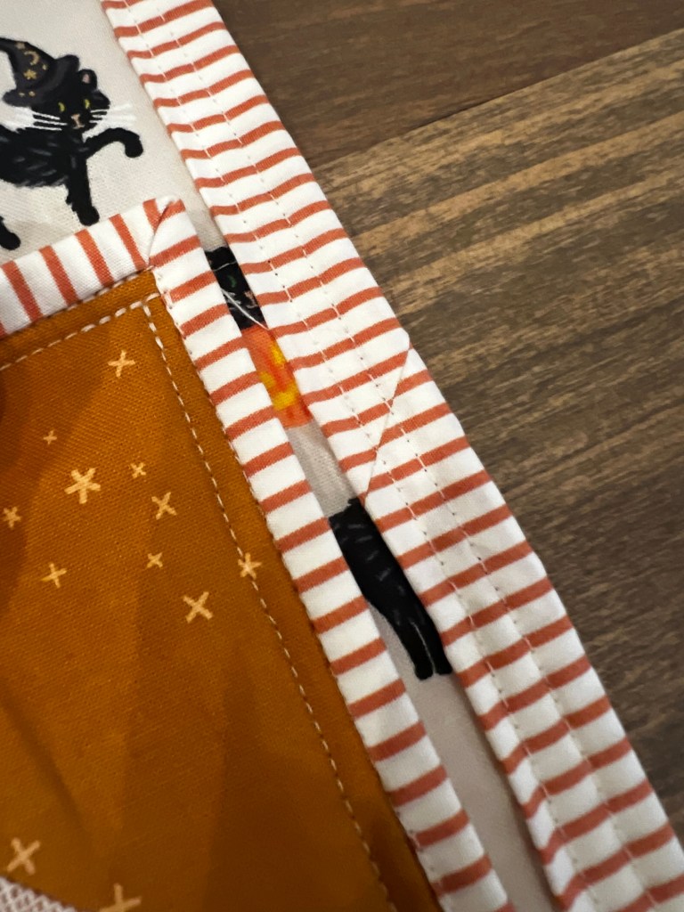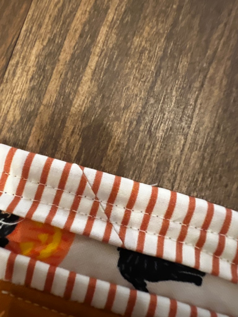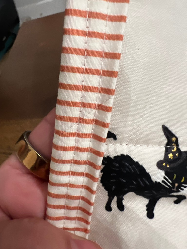It’s on and just like I thought, I could see the imperfections I had made when making the binding. It was matching the stripes that was a pain. When I went to sew it, the piece would slip and cause it to be off. I did get one on there perfectly though. One mistake I did make with the Binding was pulling it too tight. After I was done sewing it there was a big flap, so I decided to add another stitch all the way around and it looked a lot better. It’s ok, I think I like it better with it anyway.