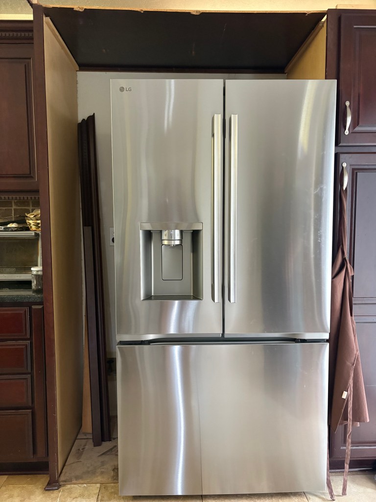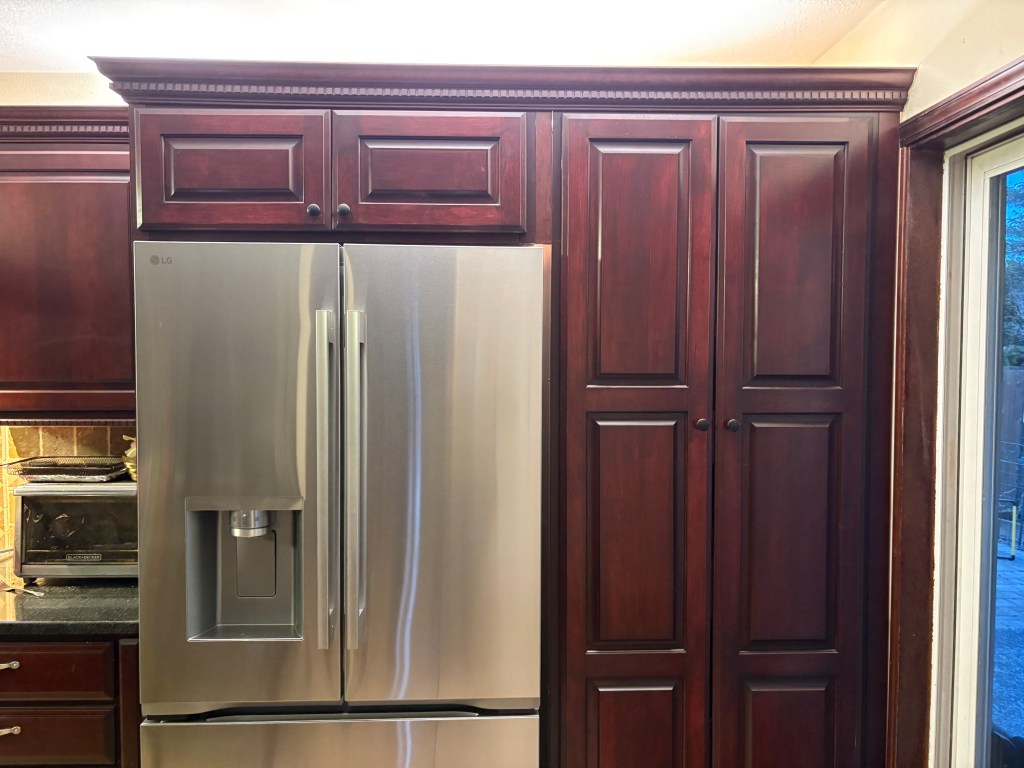 This project was for some friends. In the late Summer we started this project, a busy family so we fit in the project when it worked for all of us. They had one of those big fancy built in Refrigerators that finally was no longer worth the fix, so they bought the standard fridge which left a nice opening all around.