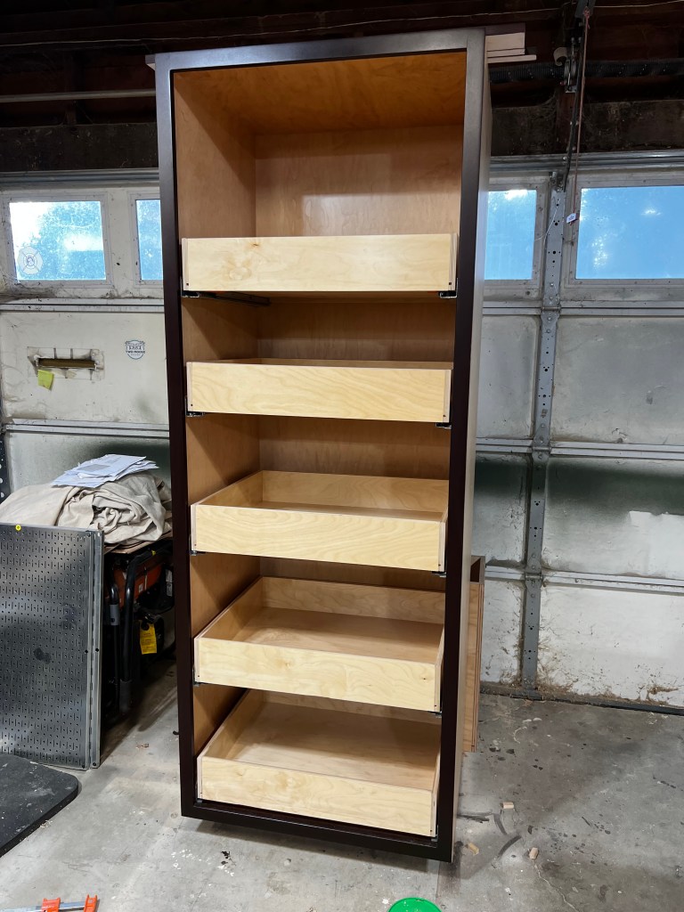 I used Pre-Finished Maple Plywood for the Pantry, Maple for the face frames and BLUM soft close drawer slides. It’s time to stain the doors.I was pretty nervous about the staining and this was with the first coat. I ended up doing 3 coats of stain.